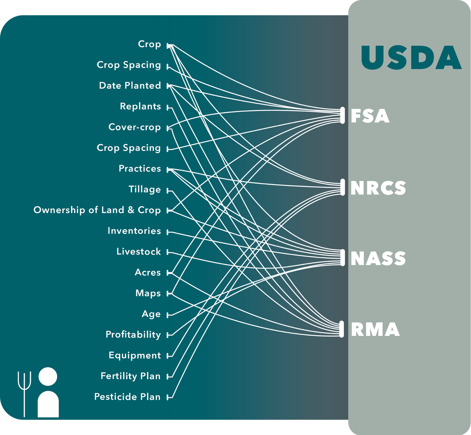 Figure 1 represents the data one farmer reports to different USDA agencies. As depicted, the farmer must report identical data points, such as crops and the date planted, four separate times.