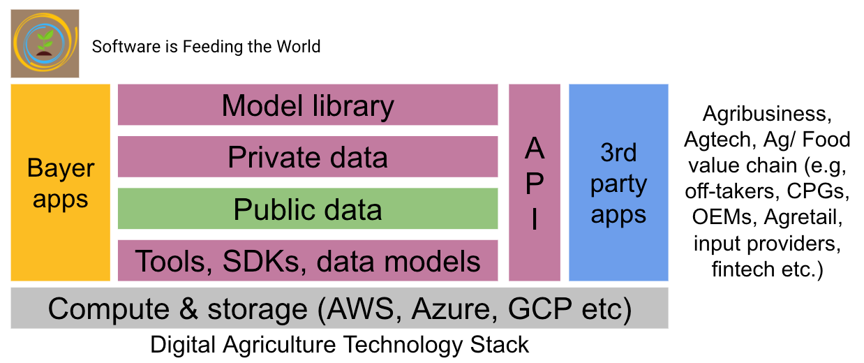 In edition 83. Picks and Shovels, I had written about the partnership between Bayer and Microsoft, and had speculated if the combination could create a platform of capabilities to power applications within agtech. I had proposed a technology stack for agriculture as shown below.
