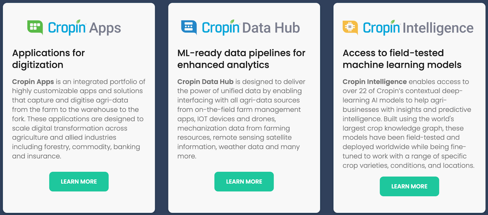 Cropin has three sub-platforms that allow farmers and other stakeholders in the food value chain to access tools for earth observation, remote sensing and data and machine learning to help them better manage crops and harvests.
