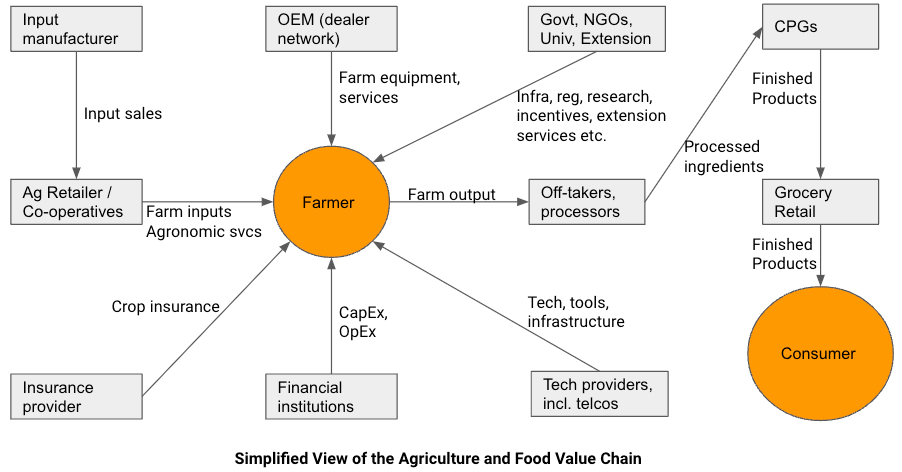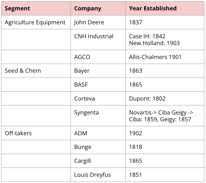 The most important physical products for farming are inputs like seed and chemicals, and equipment like tractors, and harvesters. These companies have maintained an iron grip on the product portfolio, and most importantly the distribution channel for input products (especially in the global north).