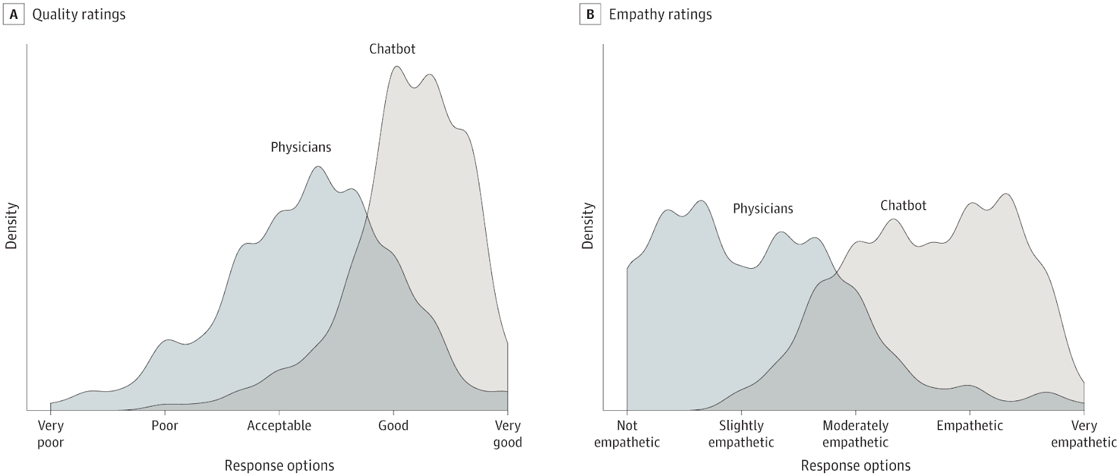 “In this cross-sectional study of 195 randomly drawn patient questions from a social media forum, a team of licensed health care professionals compared physicians’ and chatbot’s responses to patient’s questions asked publicly on a public social media forum. The chatbot responses were preferred over physician responses and rated significantly higher for both quality and empathy.”