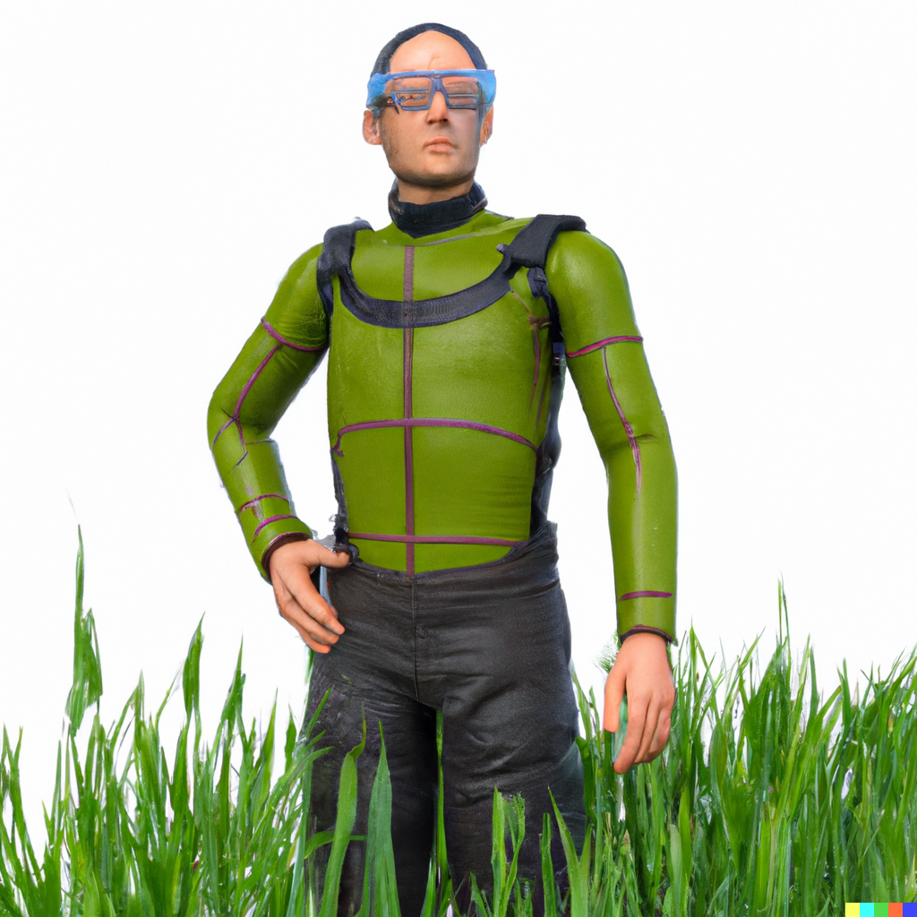 Image generated using DALL-E (prompt “high tech bionic farmer with farming clothes”)