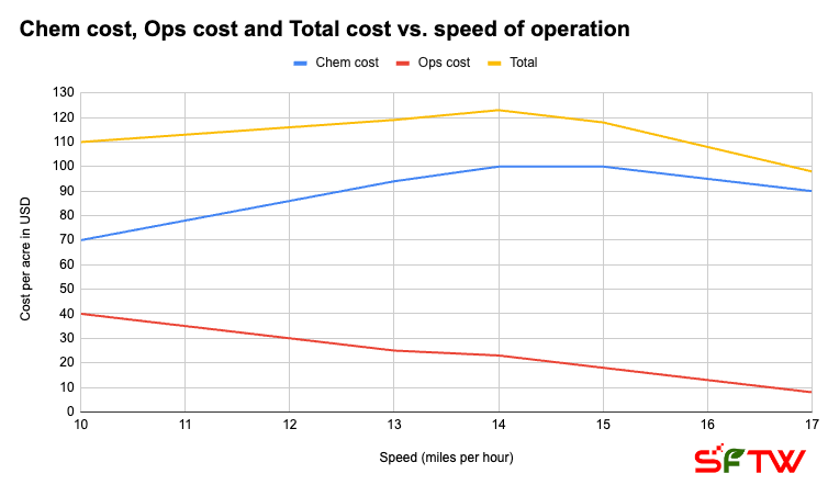 At lower equipment speeds, you will spend more time in the cab (especially if you have a human driver), but your chemical costs are lower. This will lead to higher labor costs (assuming non-autonomous operations), potentially higher fuel costs, but better weed management and lower chemical costs. The right balance will depend on many factors, including the field and growers' unique needs.