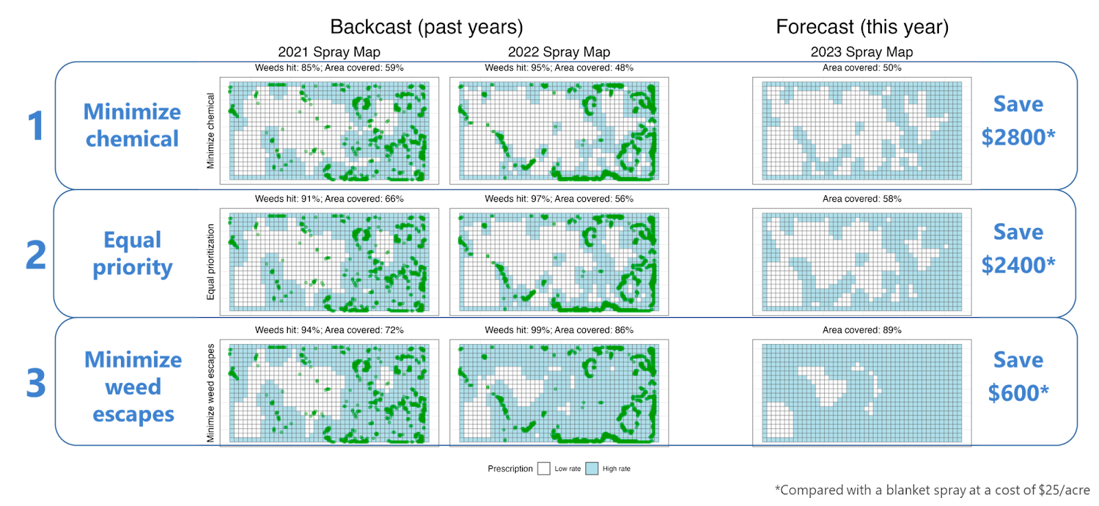 Other variables include the type of chemical mix used based on weed density and past experience, timing, and dosage applied. There are still many unknowns in the technology and business model for spot spraying.