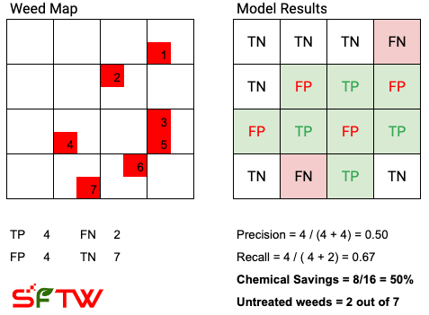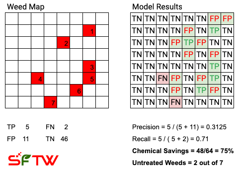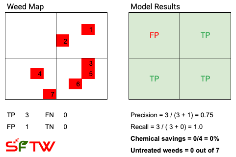 As you can see, in this case the chemical savings are less than the theoretical maximum, and at the same time, it misses 2 out of the 7 weeds (highlighted as FN, False Negative)