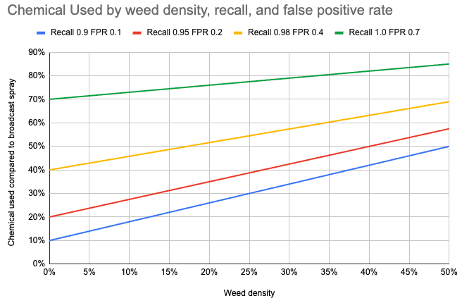Chemical sprayed = Weed density x recall + (1 - weed density) x false positive rate.