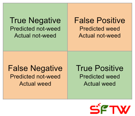 For the case of identification of weeds using a machine learning model, one can construct a simple 2 x 2 matrix.
