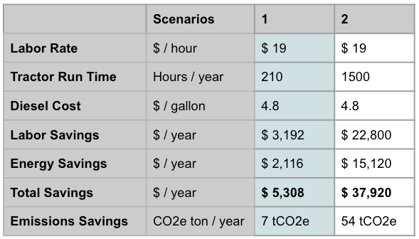 If we use the default assumption of tractor run time of 1500 hours per year, the operational savings jump to $ 37,920 per year. (see column 2 in table below).