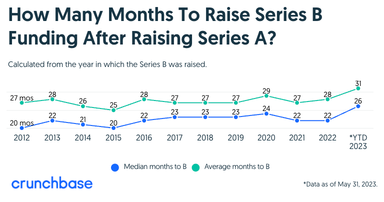 But as venture funding contracts, the lag time between rounds gets longer. We saw evidence of delays last year,, with the average time lapse between Series A and Series B hitting 31 months — the longest span in at least 12 years.