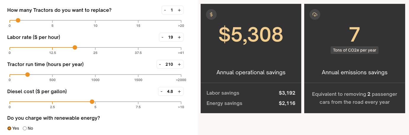 Monarch has a convenient annual operational savings calculator on its website. The calculator asks for inputs like the number of tractors you want to replace, labor rate for farm labor, tractor run time (hours per year), diesel costs (dollars per gallon), and whether you charge with renewable energy (for example, solar).
