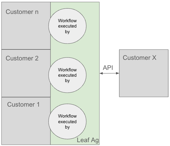 In the graphic above, Customer X can connect to customers 1, through n by making one connection to Leaf. Similarly Customer 1 connects with Customers 2 through n, and Customer X, by having Leaf execute most of its data management workflow.