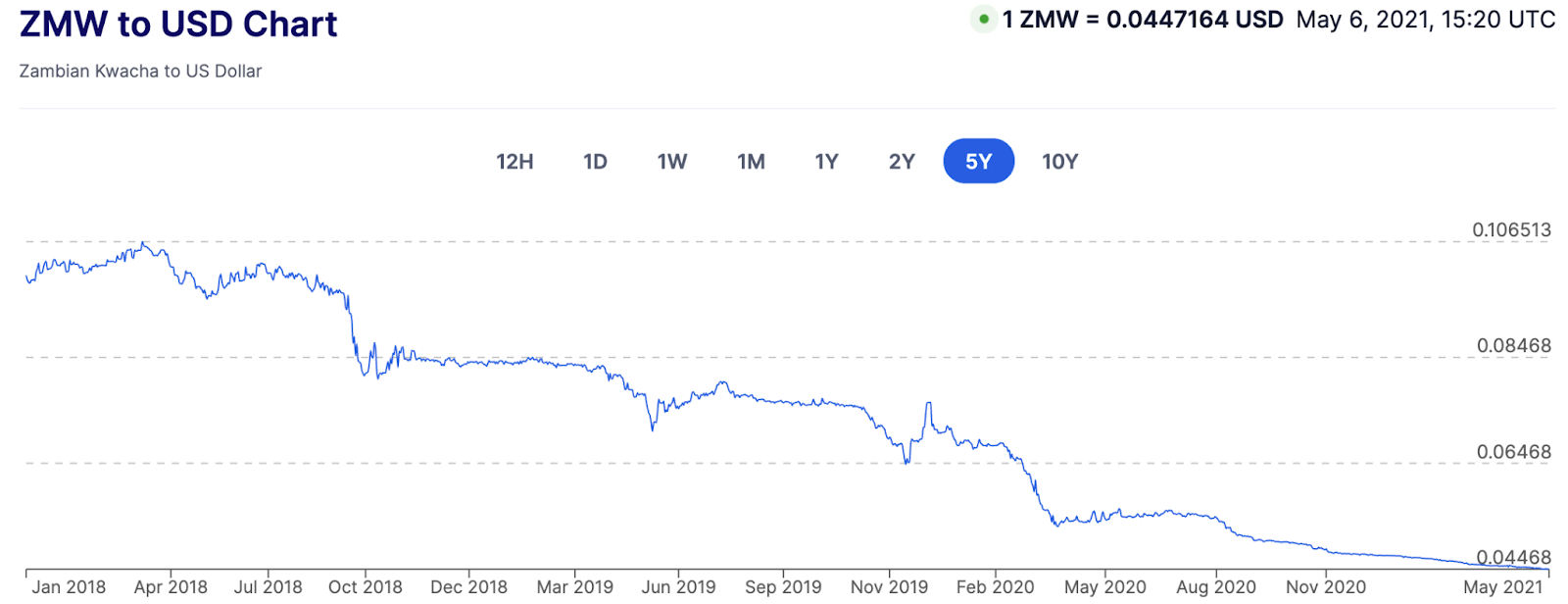 USD to Zambian Kwacha exchange rate for the last 10 years. Source: xe.com