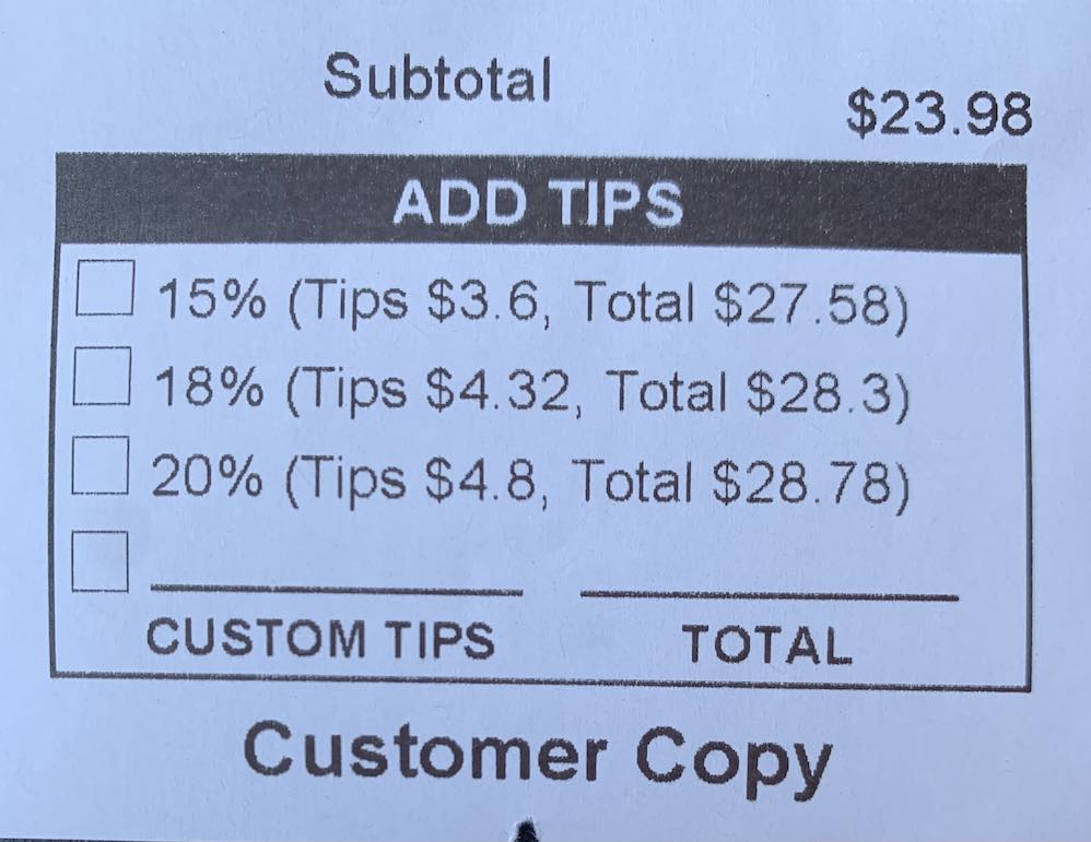 I want to highlight another minor example, which I encountered just a few days ago. My spouse and I were out for lunch at a Chinese restaurant. At the end of the meal, I got a paper receipt to sign after paying by credit card. (Yes, the US is still a bit outdated compared to the EU!) Most paper receipts have a line for you to write down your tip amount, write the total, and then sign. Many paper receipts will include suggested tip amounts and associated totals for different tip percentages. (for example, 15%, 18%, 20% etc.) Almost all receipts make you write down the tip amount, the total, and sign. The credit card receipt at this Chinese restaurant, and had improved the experience marginally, but it had definitely improved it. See if you can spot a slightly improved user experience, compared to what you are used to with paper receipts.
