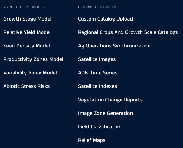Cropwise also provides a set of APIs across core services, AgInsights, and remote sensing. (See example of remote sensing APIs and Cropwise Services offered on the Open Platform).