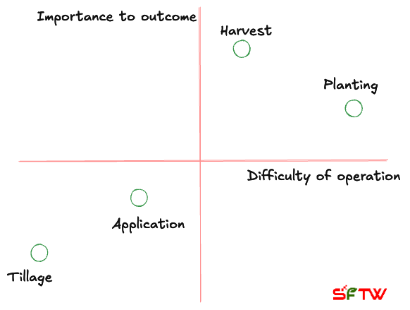 I have drawn a representative 2 x 2 diagram (commodity row crops) for how important an operation is to the end outcome of yield, and how difficult the operation is in terms of planning and actual execution. The relative position of the operations on the 2 x 2 matrix are empirical in nature and not to scale.