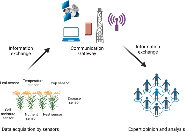In an effort to capture, understand, and address field variability, we can use inexpensive sensors that are easy to install and maintain scattered throughout an area. These sensors will communicate back to a more advanced sensor that serves as a central hub. Then, either through edge computing, where data is processed inside the central hub, or by analysis in the cloud, a more complete picture of the field will be created. Decisions can also be transmitted back to the sensor to take a particular action (for example, turn off irrigation, if the soil moisture goes above some threshold).