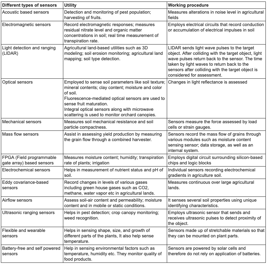 The table below summarizes the different types of sensors already available at the farm level to monitor different attributes