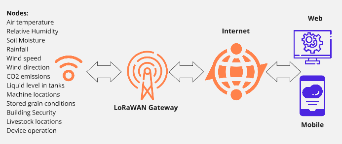 The nodes can be small and battery-operated sensor devices, and installed in remote locations. The gateway communicates with the nodes, receiving data from the sensor devices and transmitting signals back to the sensor devices so they can be managed remotely. The LoRaWAN gateway also functions to move the data to the internet so it can be viewed by the user.