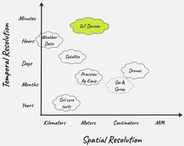 There is space for IoT devices to capture data at a higher temporal resolution, and a reasonable spatial resolution to provide real time updates on different attributes like soil moisture levels, liquid levels in tanks, livestock location, presence of pests in an area etc.