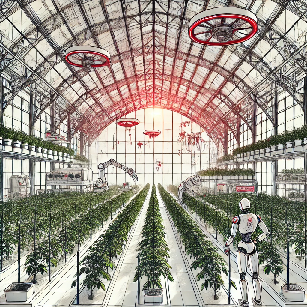 Image generated by DALL-E “Inside of a tomato greenhouse managed by robots and drones”