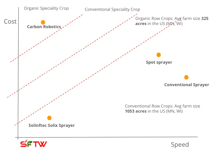 Carbon Robotics’ niche focus on laser weeding has to compete with other non-chemical approaches like mechanical weeding, other laser weeders, hot-oil based weeding (e.g. Tensile Robotics), and with chemical spray companies in the non-organic space and organic space.