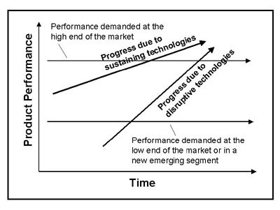 According to Clayton Christenson “disruptive innovation is the process in which a smaller company, usually with fewer resources, is able to challenge an established business (often called an “incumbent”) by entering at the bottom of the market and continuing to move up-market.”