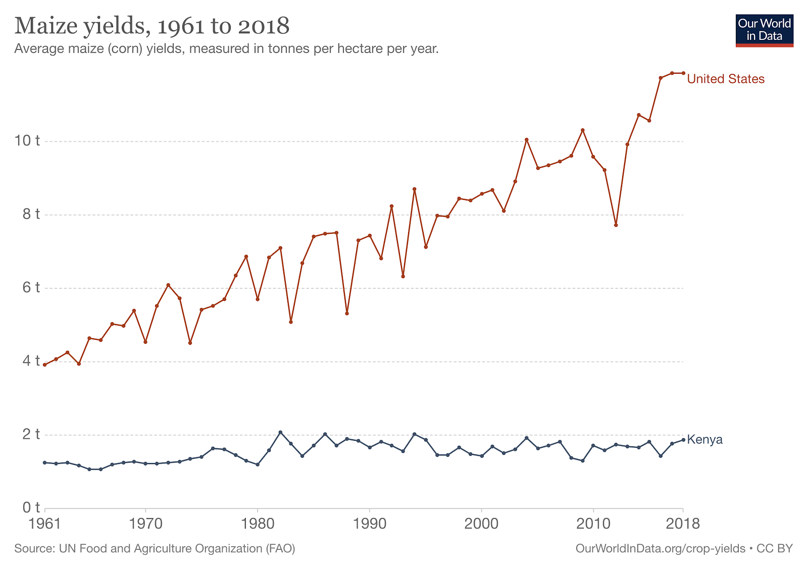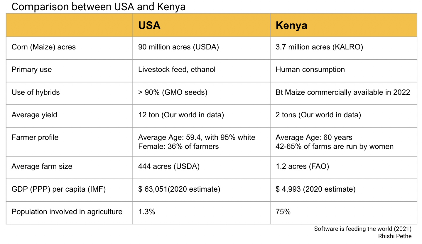 Data sources: USDA (acreage and average field sizes), KALRO, Kenya advances GM Maize, FAO, GDP, Farmer profiles (USA, Kenya)