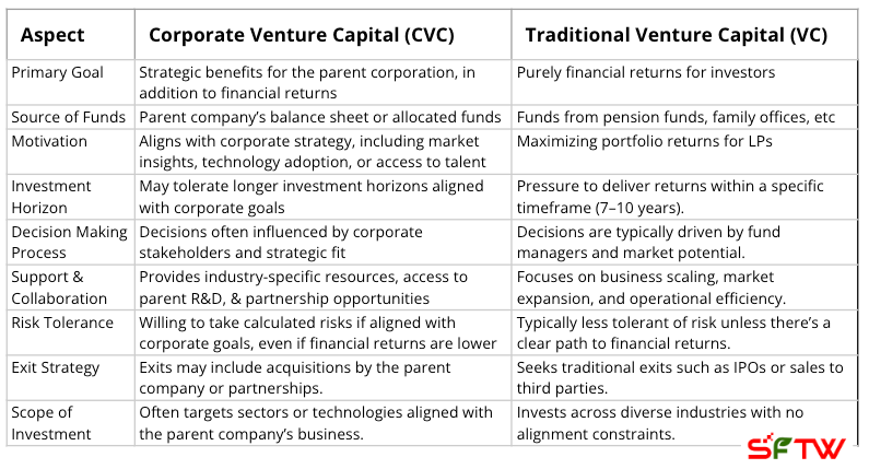 The story has been the same for other corporate VC firms over the last 12-18 months, though there are some key differences between corporate venture capital and traditional venture capital as I have highlighted in the table below.