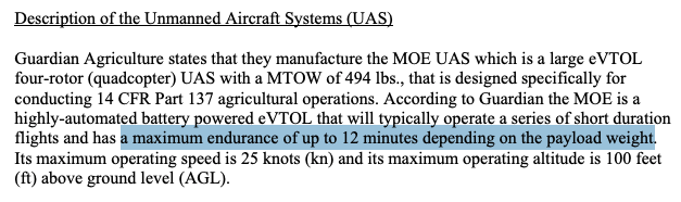 FAA exemption documents for Guardian’s aircraft, however, describe ~12 minutes maximum endurance and a 20‑gal (≈167–200 lb) payload.